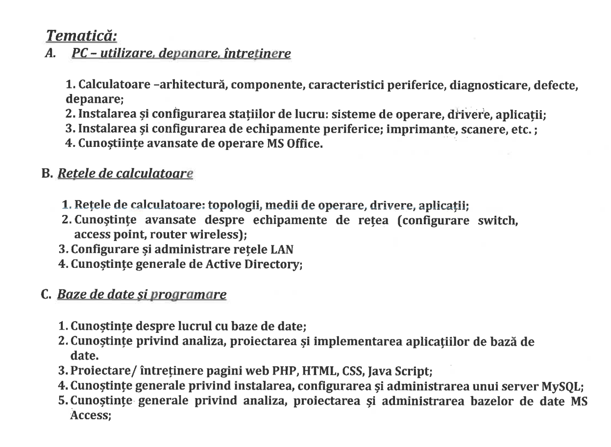 La finalul anuntului se mentioneaza bibliografia pentru concurs, ce legislatie si carti trebuie cunoscute teoretic pentru acel post, plus tehnologiile cerute pentru zona IT. Aici situatia este extrem de asemanatoare cu anunturile din mediul privat deoarece exista tendinta clara de a indesa cam tot ce se poate in acea lista din anunt, un pic si de programare Java, si Pyhton, merge si un SQL, apoi framework-uri de gestioanare a bazelor de date, Microsoft Office, si completam si cu putin Retelistica.